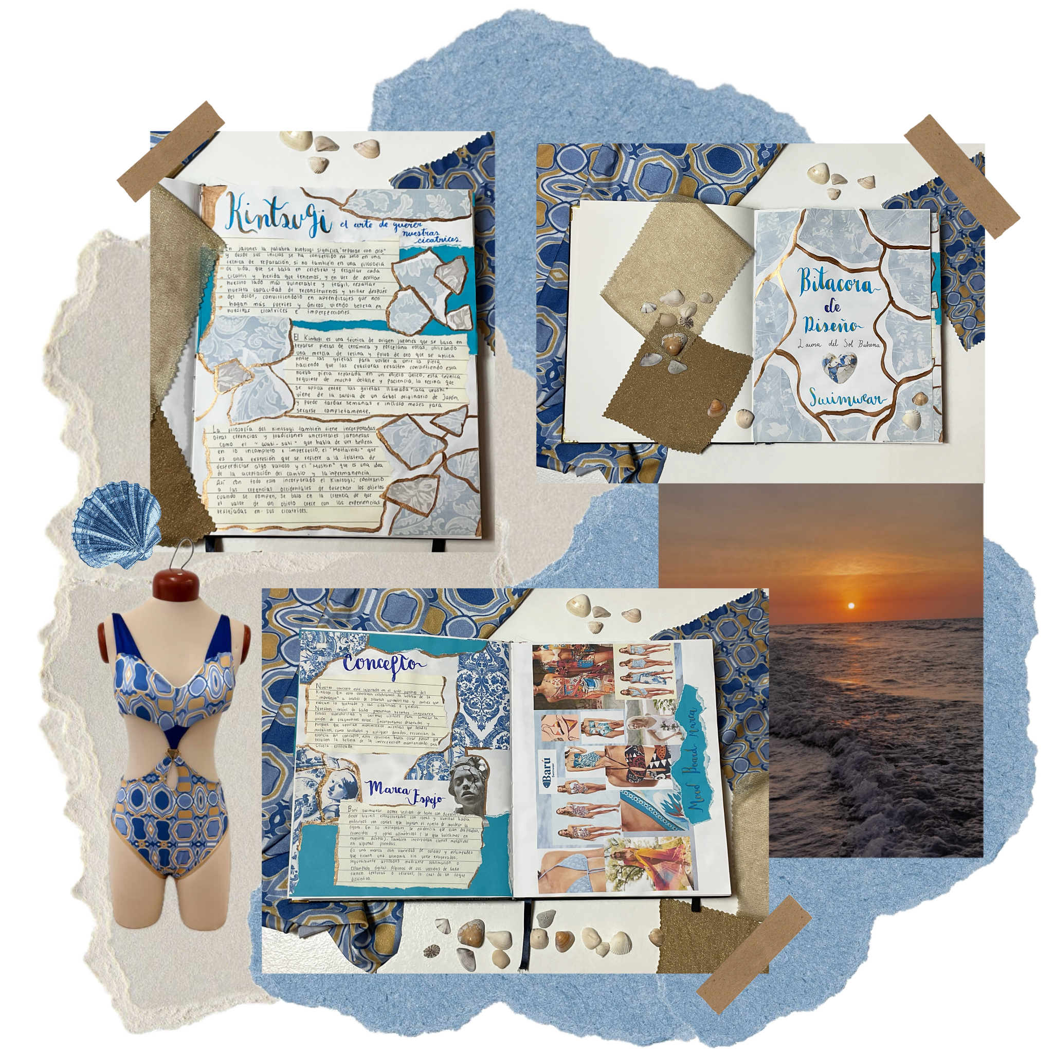 Esta colección de la linea swimwear que presenta trajes de baño y complementos, se inspira en el arte japonés del Kintsugi, una técnica que resignifica lo roto y sus fracturas al reparar las piezas resaltando sus grietas con oro, transformando la imperfección en un símbolo de arte y resiliencia. Bajo este concepto, las prendas reinterpretan lo “quebrado” a través de siluetas asimétricas, cortes irregulares y estampados que evocan la porcelana rota y buscan resaltar la belleza de lo imperfecto. Los detalles dorados, bordados y estampados actúan como metáforas visuales de esas uniones y reconstrucciones. La propuesta busca equilibrar la delicadeza, estructura y estilo en cada diseño y silueta.